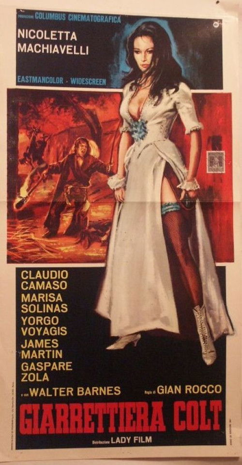 Garter Colt - At the border with Mexico, a brave young woman defends herself from the attack of the fearsome bandit, "Red", mastering a gun and the game of poker. Falling in love with a young Frenchman, he asks her to give up gambling and start a quiet and normal life, but when the young man is killed by "Red", she is determined to seek revenge. Source: SWDB http://www.spaghetti-western.net